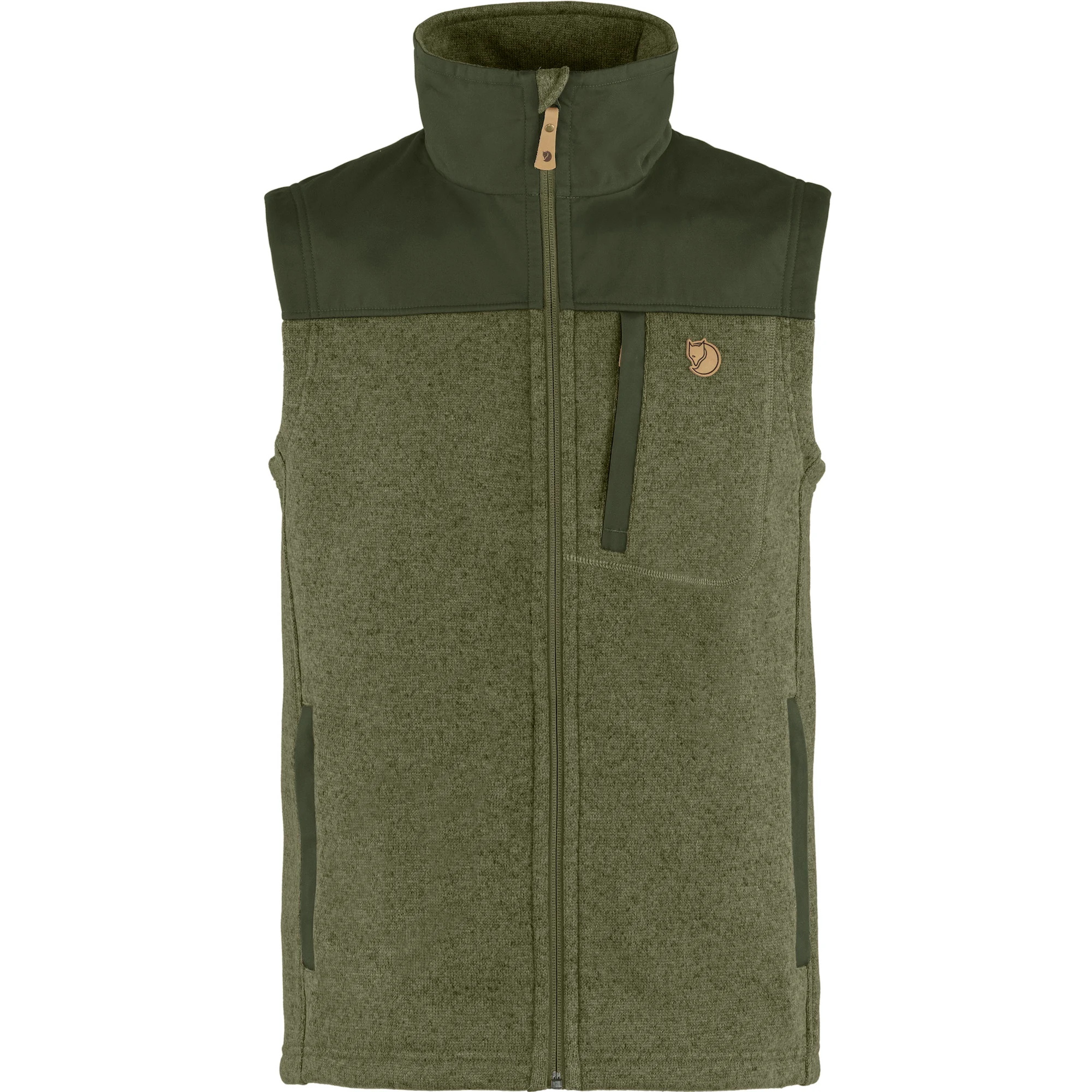 Warm, thick fleece vest that is knitted on the outside and softly brushed on the inside. G-1000 Original reinforcement across the shoulders for extra durability, which is practical when carrying a backpack. Perfect as a warm middle layer when skiing and can also be worn when you are relaxing in the cabin. Two side pockets and one breast pocket. Zipper in the front with protective flap at the chin. Regular fit. Have details of animal origin.
